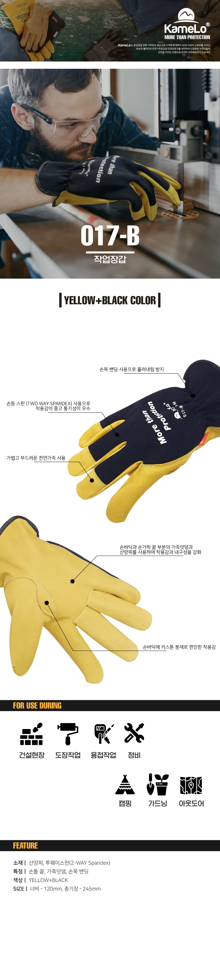 특징ㅣ손끝, 검지 가죽덧댐, 손목밴딩, 손등스판소재
