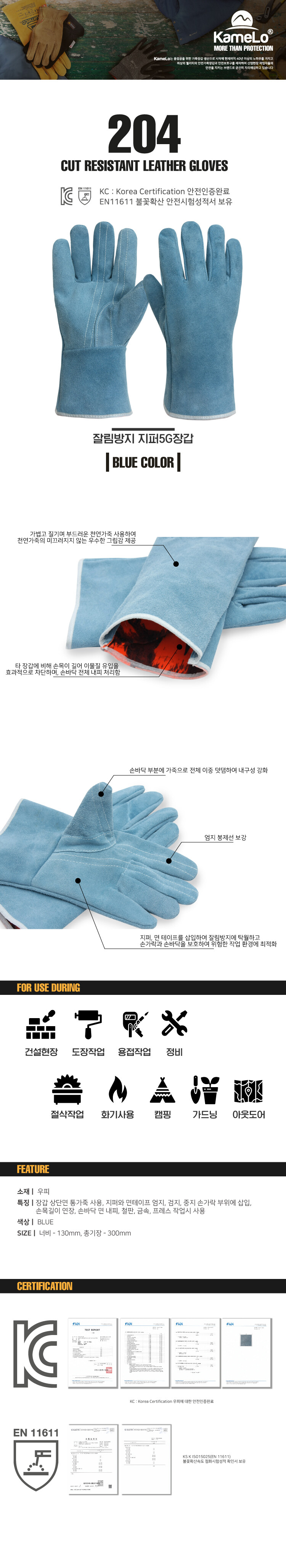 특징ㅣ장갑상단면 통가죽 사용, 지퍼와 면테이프를 엄지/검지/중지 손가락 부분에 삽입, 엄지봉제선 가죽 이중덧댐, 철판, 금속, 프레스작업시 사용