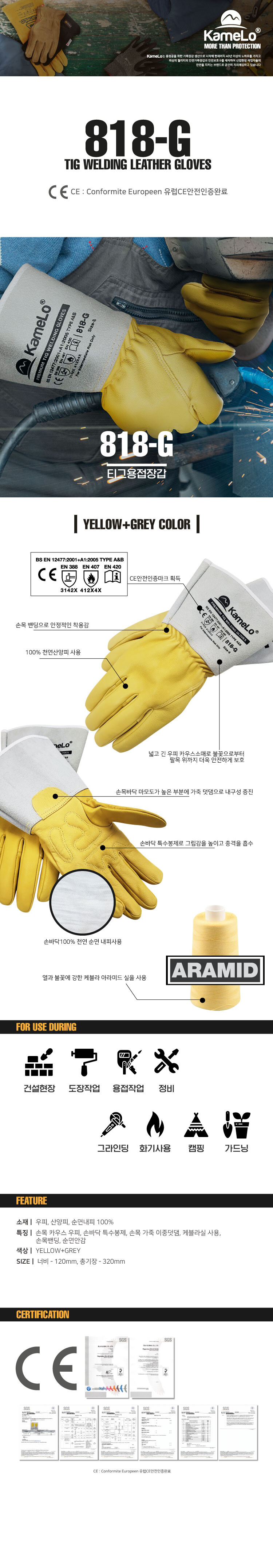 특징ㅣ손목 카우스 우피, 손바닥 특수봉제, 손목가죽 이중덧댐, 케블라실사용, 손목밴딩, 순면안감