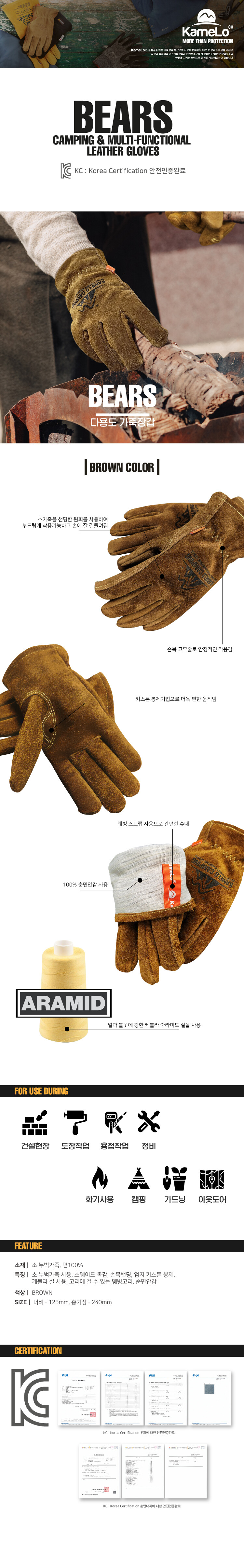 특징ㅣ소 벨벳샌딩 가죽사용, 스웨이드 촉감, 유연한 움직임, 손목밴딩, 엄지 키스톤봉제, 케블라 실 사용, 고리에 걸 수 있는 웨빙고리, 순면 안감