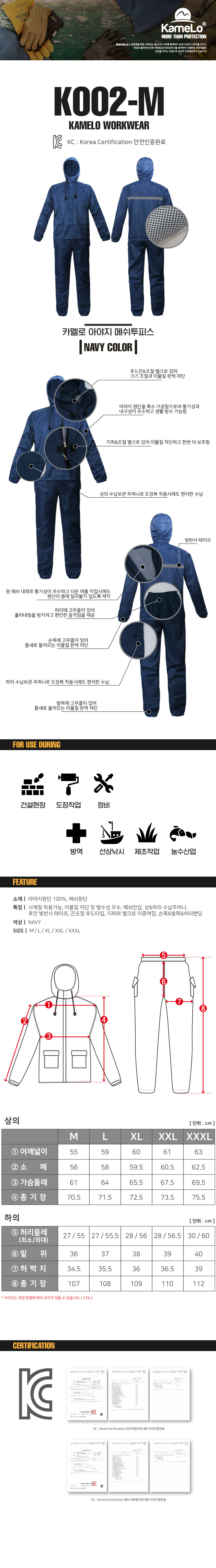 특징ㅣ4계절 착용가능, 메쉬안감, 이물질 차단 및 발수성 우수, 상하의 수납주머니, 후면 빛반사테이프, 끈조절 후드타입, 지퍼와 벨크로 이중여밈, 손목&발목&바지허리 밴딩마감