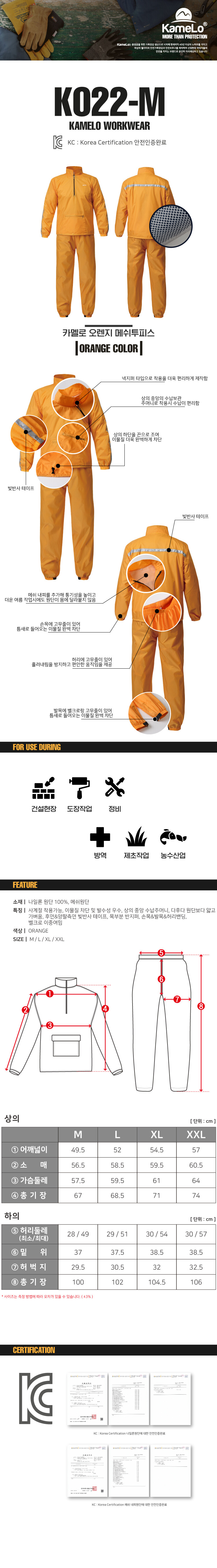 특징ㅣ4계절 착용가능, 메쉬안감, 이물질 차단 및 발수성 우수, 얇고 가벼운 원단, 상의 중앙 수납주머니, 후면과 양팔측면 빛반사테이프, 목부분 반지퍼, 손목&발목&바지허리 밴딩마감
