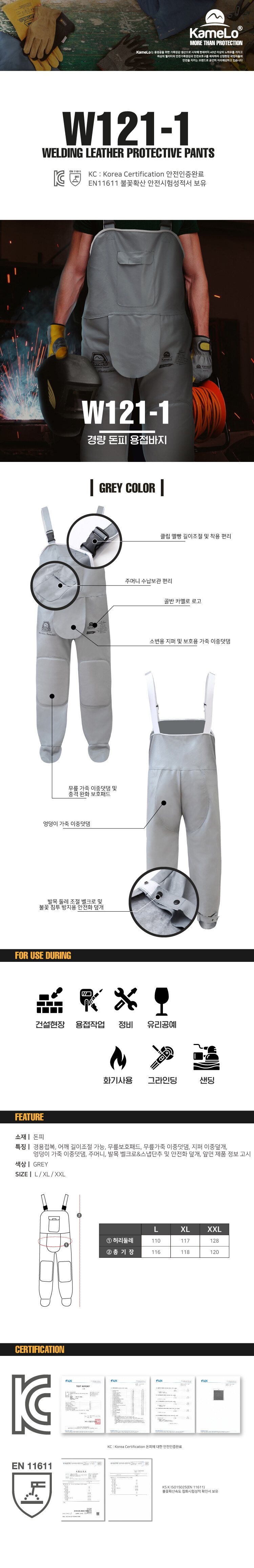 특징ㅣ경용접복, 어깨 길이조절가능, 무릎보호패드, 무릎가죽 이중덧댐, 지퍼 이중덮개, 엉덩이가죽 이중덧댐, 가슴 앞주머니, 발목벨크로&스냅단추 및 안전화 덮개, 앞면 제품정보고시